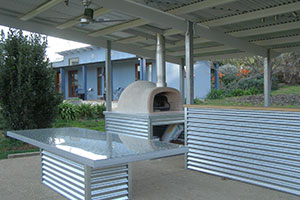 The ensuites both feature walk in showers with tiled floors throughout. Heated towel rails, custom built vanities and glass splashbacks all provide for a sense of style and quality, which is at the heart of the Casa Luna experience. Corner Toilet suites maximise space without compromising the overall effect. The construction of a free standing Outdoor Kitchen area links the two buildings and enhances the facilities for guests with a wood fired pizza oven, barbecue and custom built table and benches. Casa Luna is a great example of a partnership between Clients, Designer and Builders, all sharing a clear focus on quality and integrity in design, construction and finish. Successful communications, written, drawn and discussed, are the key tools. An ability to relate to the values the Clients are trying to achieve is vital. We’re very proud of our work at Casa Luna, both in the buildings and in the relationships.